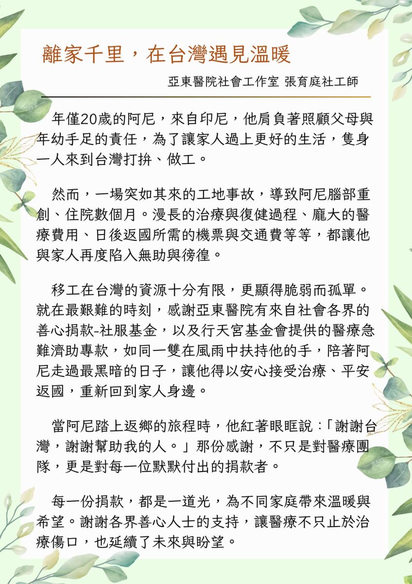 在最無助的時刻,亞東醫院整合社會各界善款──社服基金及行天宮基金會醫療急難濟助專款,陪他走過治療與復健,順利平安返國。回國之前,他紅著眼眶道謝......read more