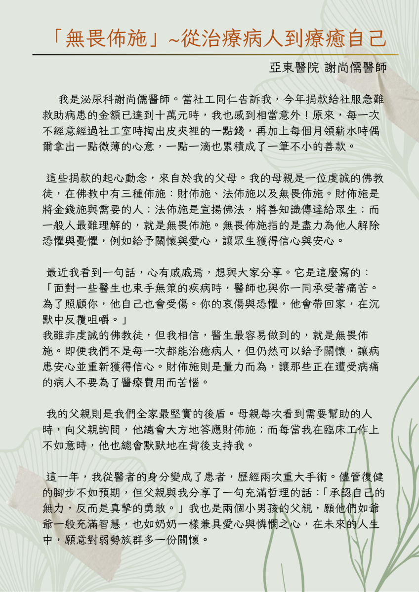 我是泌尿科謝尚儒醫師。當社工同仁告訴我,今年捐款給社服急難救助病患的金額已達到十萬元時,我也感到相當意外!原來,每一次不經意經過社工室時掏出皮夾裡的一點錢,再加上每個月領薪水時偶爾拿出一點微薄的心意,一點一滴也累積成了一筆不小的善款。....read more