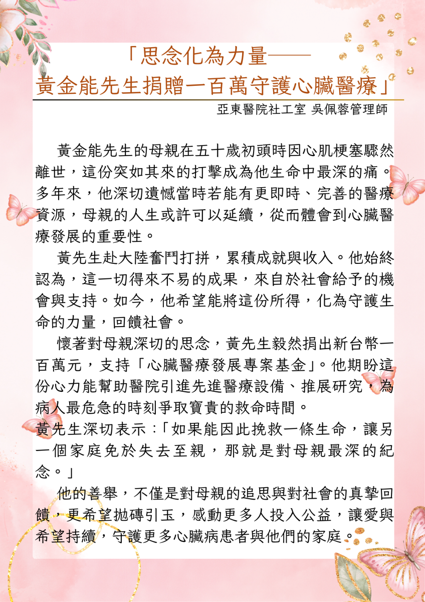化為力量──黃金能先生捐贈一百萬守護心臟醫療