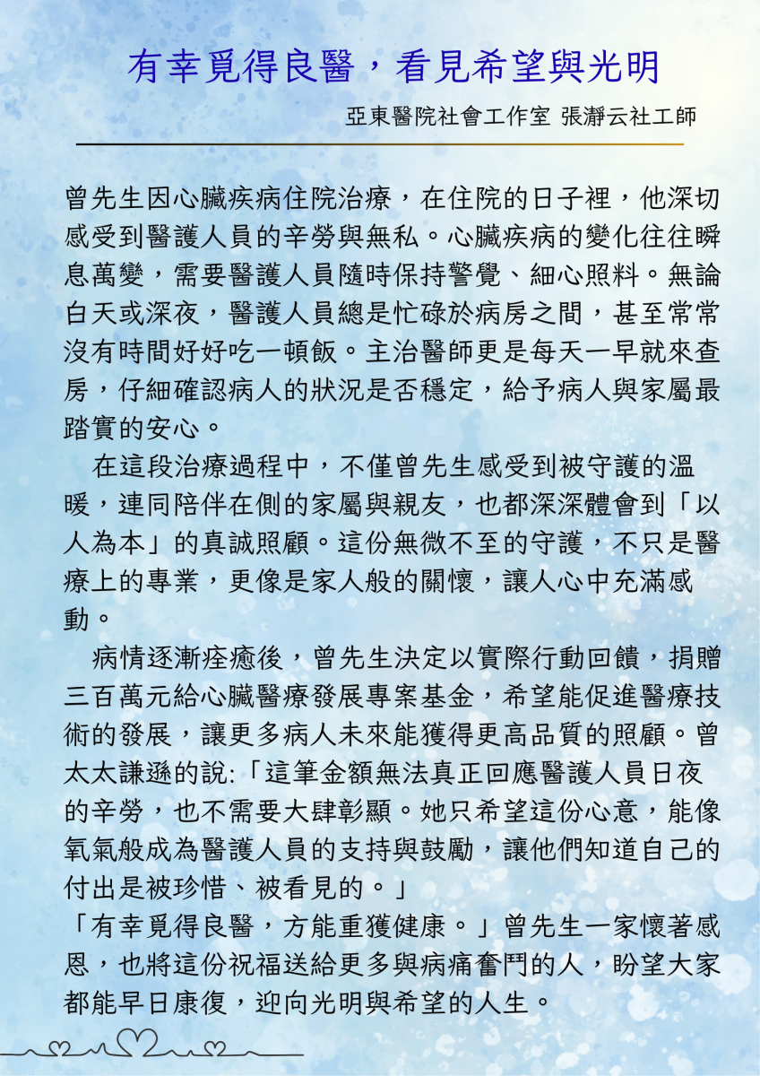 感謝經過醫護人員的照顧我順利治療,在出院的這天,我決定捐贈1百萬給社服基金,這不僅是我對醫護人員的感謝,更是我對生命的感悟和對社會的回饋。我希望我的小小善舉能夠幫助更多的人,讓更多的人感受到生命的溫暖和人間的真情....read more